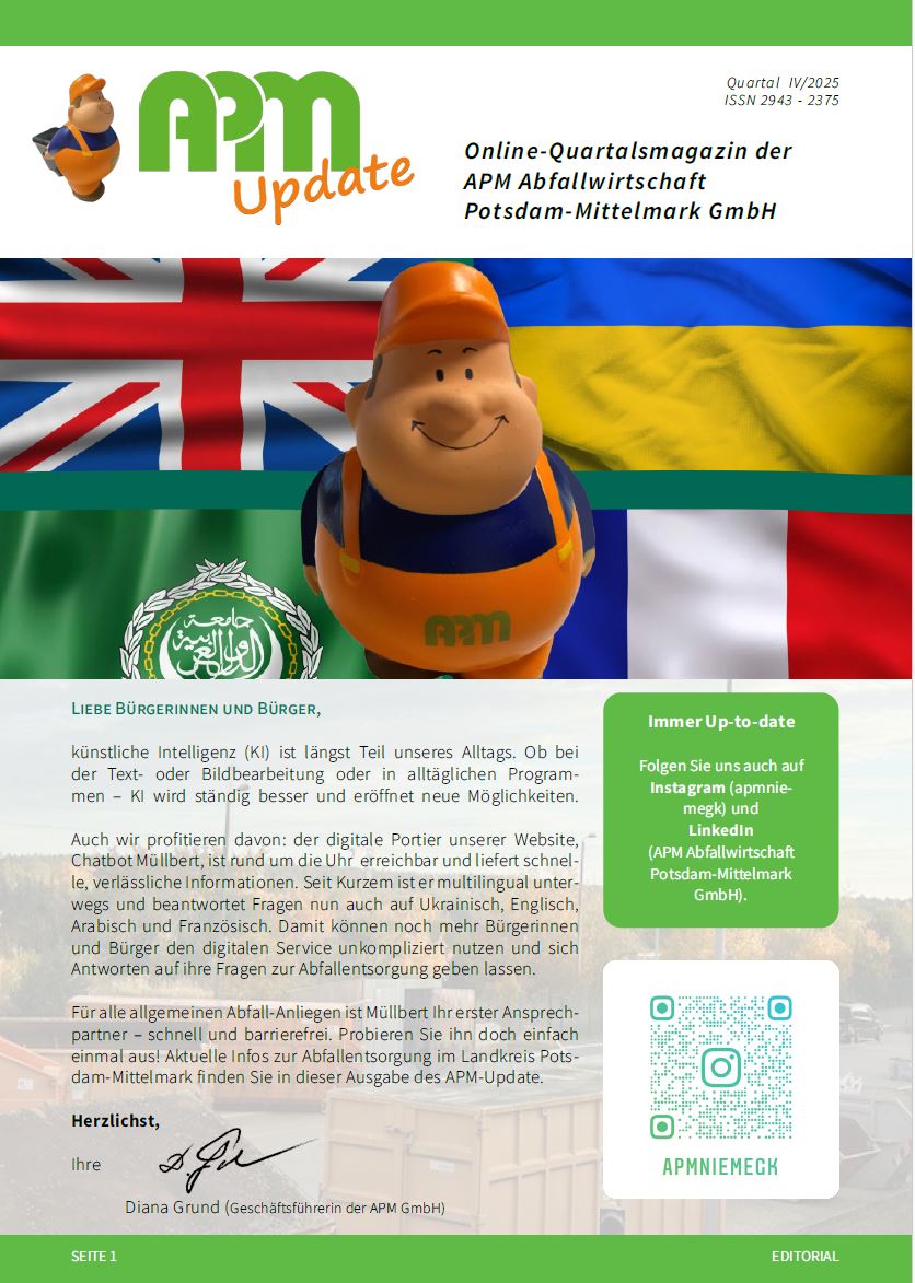 wir freuen uns sehr, Ihnen die neue Ausgabe unseres Online-Magazins „APM-Update“ (ISSN 2943-2375) vorstellen zu dürfen! Als Ihr kommunaler Partner in Sachen Abfallwirtschaft schaffen wir mit diesem Magazin eine Plattform, um Sie regelmäßig über wichtige abfallwirtschaftliche Belange in unserem Landkreis zu informieren.